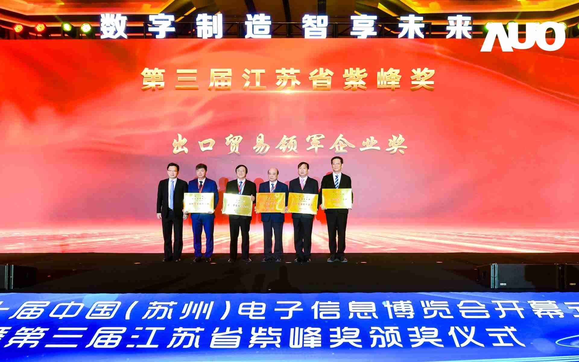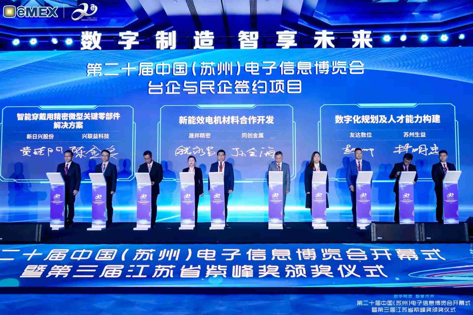 电博会开幕式当天也是第三届江苏省紫峰奖颁奖仪式,,,省台办、、、、工信厅、、商务厅、、、、苏州市相关领导均出席并颁奖。。。。该奖项为表彰对江苏高质量发展做出积极贡献的在苏企业,,,,由江苏省政府专门设立。。。z6mg·人生就是博光电 (苏州) 总经理郭振明代表上台领奖,,,,这也是z6mg·人生就是博苏州连续三次蝉联紫峰奖 出口贸易领军企业奖。。。。z6mg·人生就是博数位总经理赵丽娜女士,,,,也参与本次开幕式,,上台为本地化赋能签署战略合作协议,,将优质服务资源集合、、、、下沉到更多细分行业,,,为更多地区的制造企业提供数字化转型服务。。。