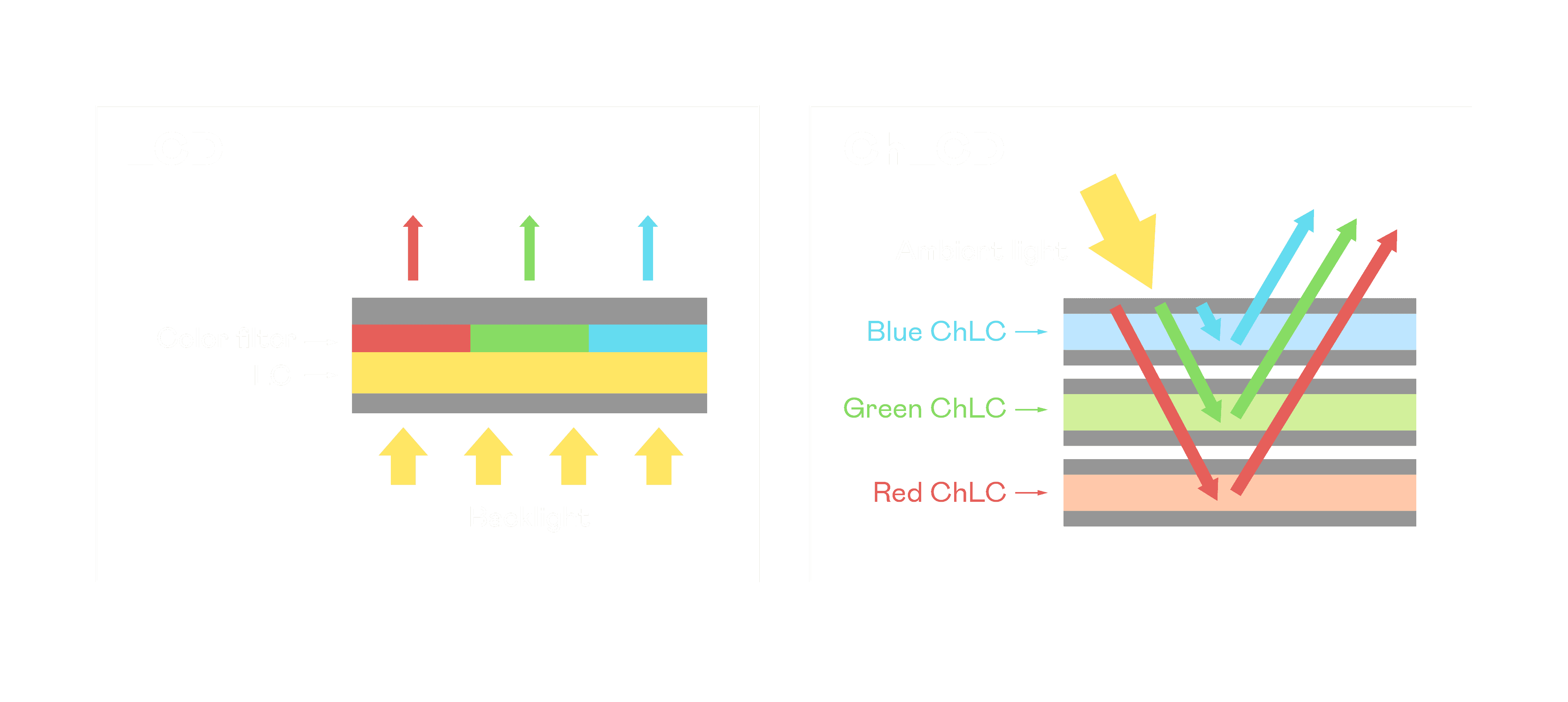 ChLCD 胆固醇液晶就如同纸张一样,,,,透过反射环境光来显示影像,,因此长时间观看不易造成人眼视觉疲劳,,可达到护眼效果。。当处于户外阳光下使用,,,LCD 影像容易失真而不易观看,,,但胆固醇液晶仍可维持较佳的影像品质。。。